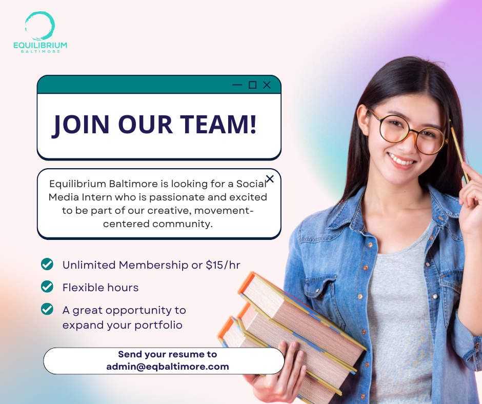 Equilibrium Baltimore is looking for a creative, reliable, and passionate Social Media Intern to help us grow our digital presence and share the magic of our movement-based wellness community.